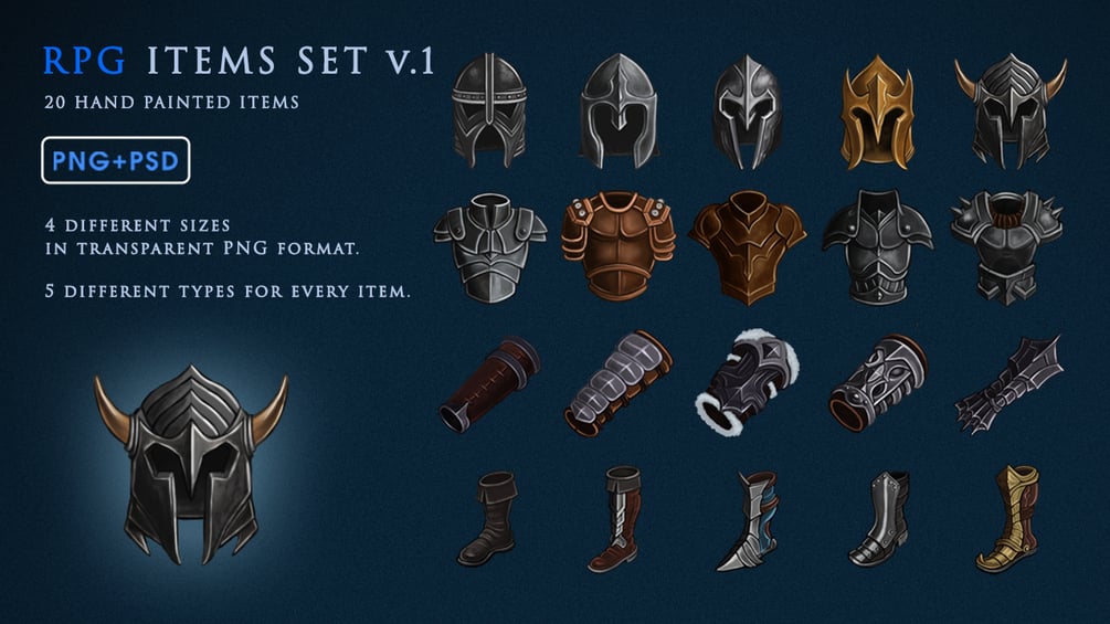 A set of 20 hand painted game items to use in any RPG/MMORPG fantasy game design project. 5 different types for every item.