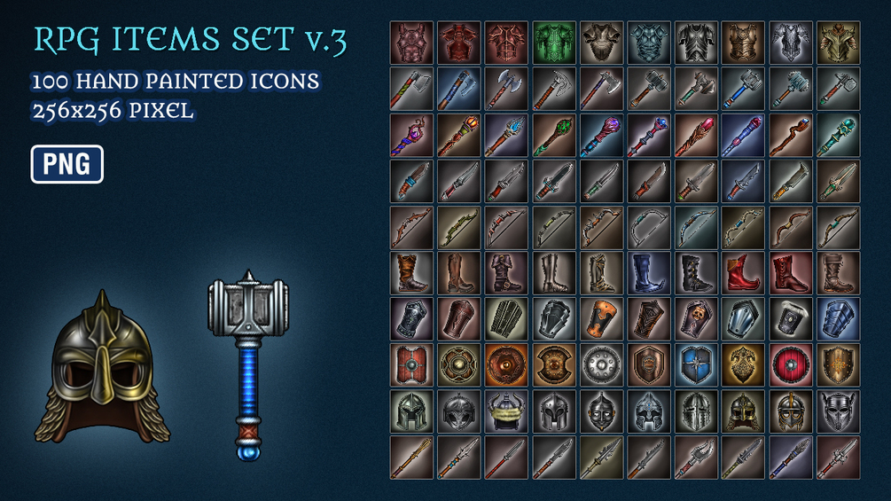 A set of 100 realistic hand painted RPG/MMORPG style armors and weapons.