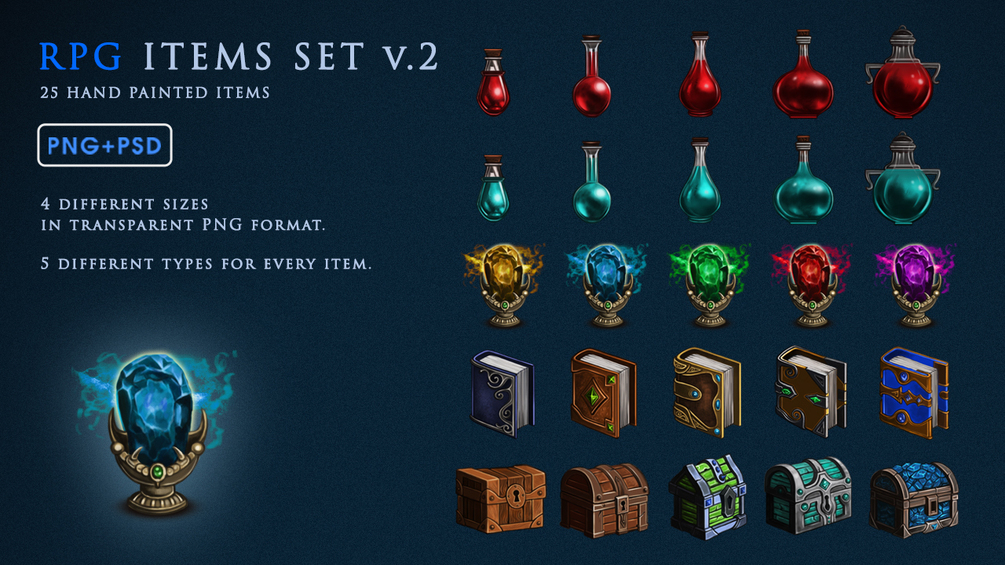A set of 25 hand painted game items to use in any RPG/MMORPG fantasy game design project.